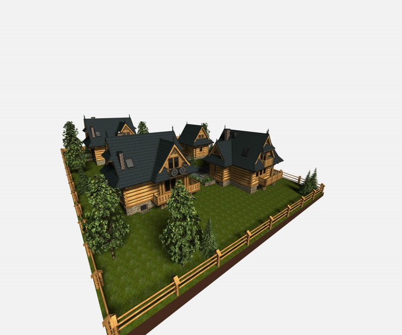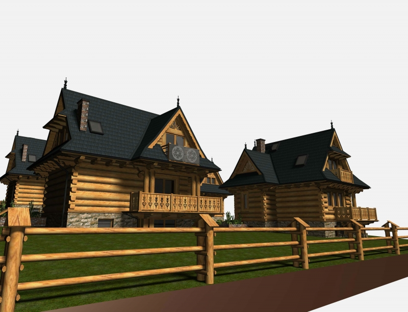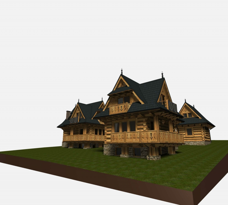 Trzy budynki jednorodzinne z samodzielnymi mieszkaniami, które są podpiwniczone. Domy wykonane są z płaz półokrągłych. Pokryte są one blachą gontopodobną, która jest niepalna.Powierzchnia użytkowa takiego domku to ok 110-120 m2 . Budynki są wykończone wewnątrz. Działka na której stoi dom ma ok. 320 m2 .Instalacje elektryczne, centralne oraz kanalizacja zostały już wykonane. Woda pochodzi ze studni głownej ( na 4 budynki).