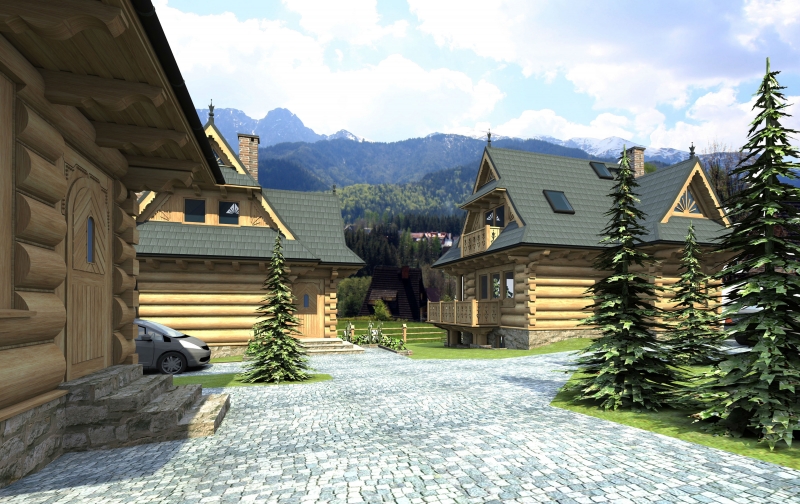 Na dole takiego domku znajduję się salon z aneksem kuchennym, korytarz, WC, a na piętrze 3 sypialnie oraz łazienka. W piwnicy znajdą Państwo salę kominkową, saunę oraz pomieszczenie na skład opału. Każdy budynek posiada taras z którego roztacza się przepiękny widok na Tatry. Od strony południowej stan przestrzenny- niebudowlany.